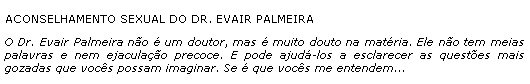 Mas, para a felicidade de vocês, o Dr. Evair Palmeira não os deixará de queixo caído diante das dificuldades. Eu os oferecerei uma série de dicas após as quais vocês ficarão é de boca aberta. E alerta. Tenho certeza de que vocês me entenderam. Sigam-nas, as minhas dicas, e os resultados líquidos serão os esperados. Abandonem-nas, e seus tão queridos sonhos murcharão. Eles e outras coisas. Mas chega de conversa mole. Passemos à conversa dura e duradoura. Eis as dicas: